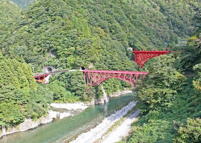 並んでかかる2本の赤いアーチ、トロッコ電車が走る現在の「新山彦橋」とかつての鉄道峡「旧山彦橋」。列車の音がやまびことなって温泉街に響くことから「山彦橋」という名前が付けられたそうだ。