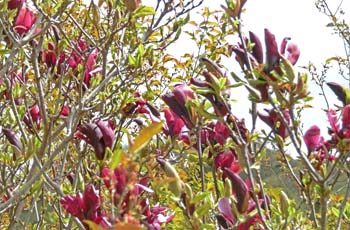 鮮やかな赤い葉をしている木を見つけた。「オオバベニガシワ」といい、春の若葉が鮮やかな赤い色をしているのが特徴で、庭木として栽培されているという。枝にモサモサと虫のようなものが付いているのが花である。