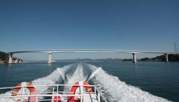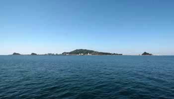 高島を過ぎると中ノ島と並んで軍艦島が見えてきた。遠く三ッ瀬と呼ばれる島が見えるがここも採掘址で、軍艦島とは海底の坑道(三ッ瀬坑道)でつながっていると聞き大変驚いた。