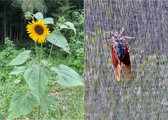 ヒマワリが咲き出した。特に植えたわけではないが、昨年の種が残っていたのだろう。セミも暑いのか、遮光ネットにしがみついている。