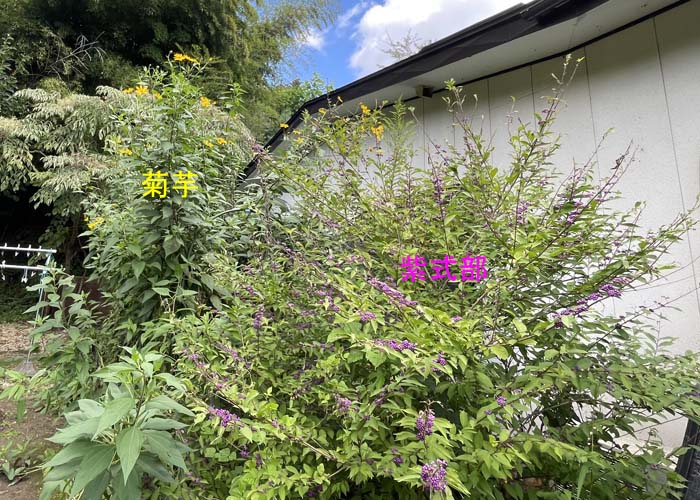 先週までの35℃を超す猛暑はどこに行ったのやら、日中も25℃を超えることはなく、朝晩は10℃近くまで冷え込むようになってきた。 庭ではキンモクセイが咲き始め、畑では菊芋が咲き、紫式部が色付きを増してきた。