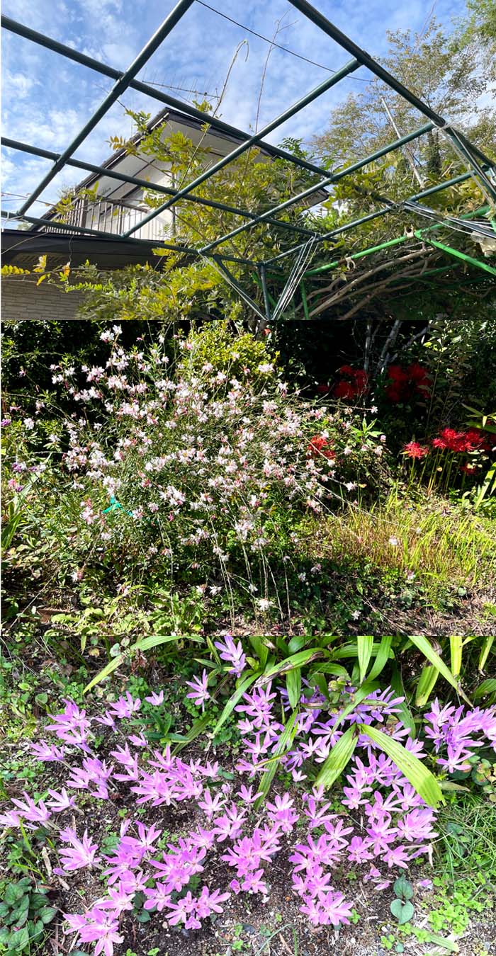 今日は比較的暖かな日となった。庭のキンモクセイの香りが室内まで漂っている。コルチカムも一斉に咲き始め庭にピンク色の模様を描いている。 さて、古くボロボロになった藤棚の交換をすることにした。立てるときは妻にも手伝ってもらったが、これがなかなか難しい。二人とも汗ダクダクになりながら何とか立てたのが下の写真。今にも崩れそうになっていた藤棚もこれで安心。来年以降、ここにも藤を伸ばす予定。