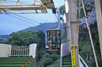 稲佐山ロープウェイ。全長1090m、高低差298m、最急勾配26°、淵神社駅から稲佐岳駅までおよそ5分。